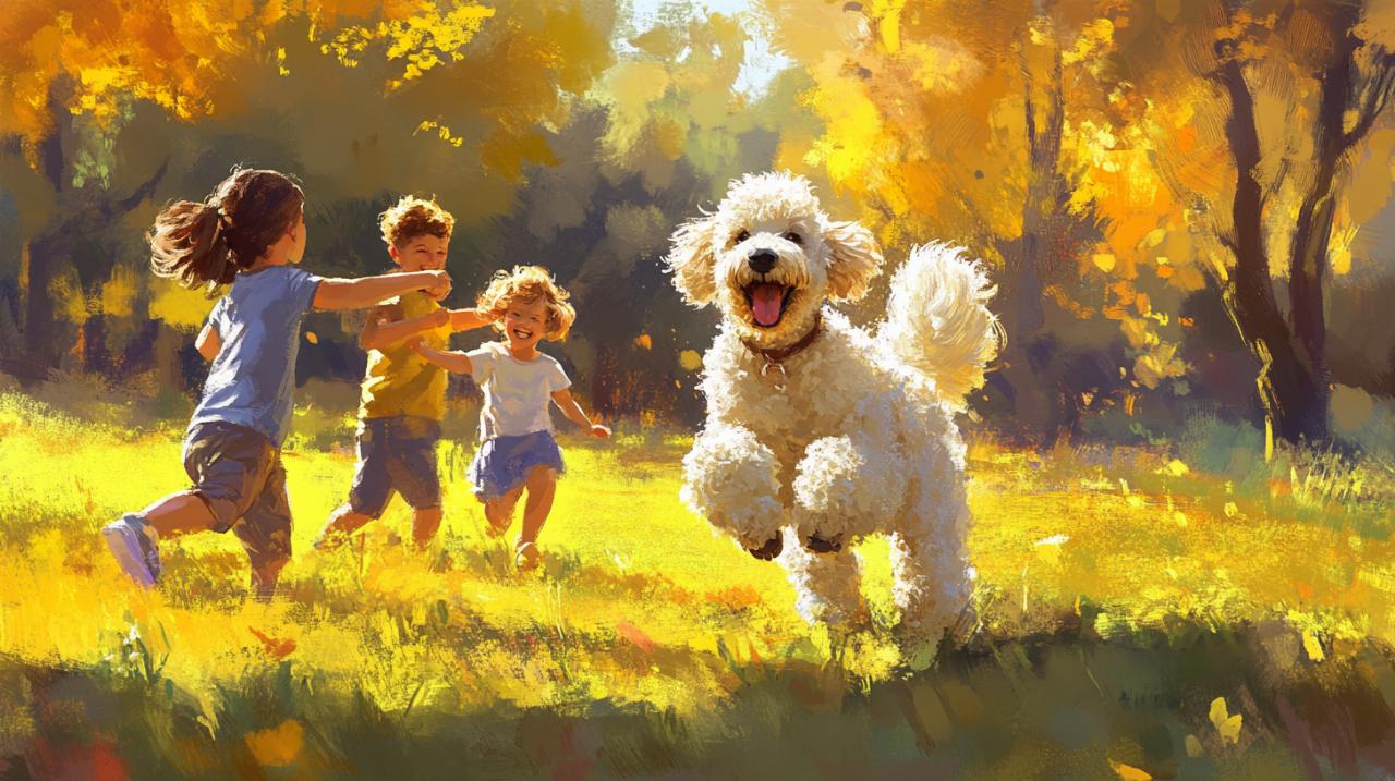 Le caniche manifeste une sociabilité remarquable avec les enfants. Son tempérament joyeux et sa patience en font un compagnon de jeu idéal. Cette race brille par son intelligence et sa capacité à apprendre par le jeu, facilitant les interactions positives. Sa nature protectrice et affectueuse garantit des moments privilégiés avec les plus jeunes membres de la famille.
